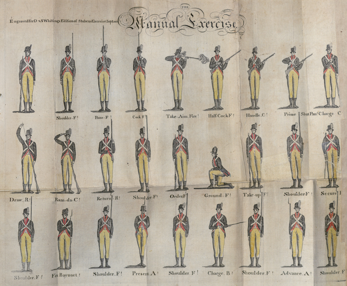 Three different hand-tinted engravings of the commands comprising the manual of arms appeared in various editions of Steuben’s Blue Book between 1800 and 1807. This one was featured in the “Improved edition” of the Regulations of “Baron de Stuben” published by Daniel and Samuel Whiting of Albany, New York, in 1803. F stands for firelock; C stands for cartridge; R stands for ramrod. That edition included the U.S. Militia Act of 1792 and the “Law Organizing the Militia of the State of New York, as now amended.”