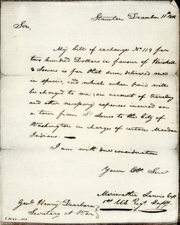 Enroute to Washington City, Meriwether Lewis posts a bill of exchange for $200 on behalf of Staunton, Virginia merchants Heiskell & Sowers. He is likely buying provisions and lodging for his party which includes several Mandans and two expedition members.