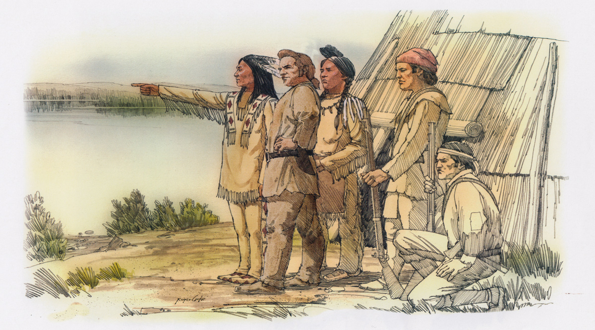 From an island on the Columbia River, William Clark is shown the mouth of the Yakima River.
