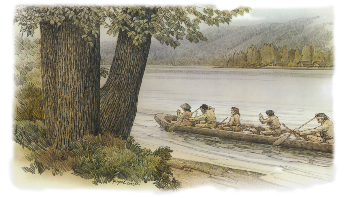 several canoes of the natives arrived at our camp . . . . these men informed us that 2 young men whom they pointed out were Cash-hooks [Clackamases] and resided at the falls of a large river which discharges itself into the Columbia on it’s South side some miles below us. we readily prevailed on them to give us a sketch of this river which they drew on a mat with a coal. it appeared that this river which they called Mult-no-mâh discharged itself behind the Island