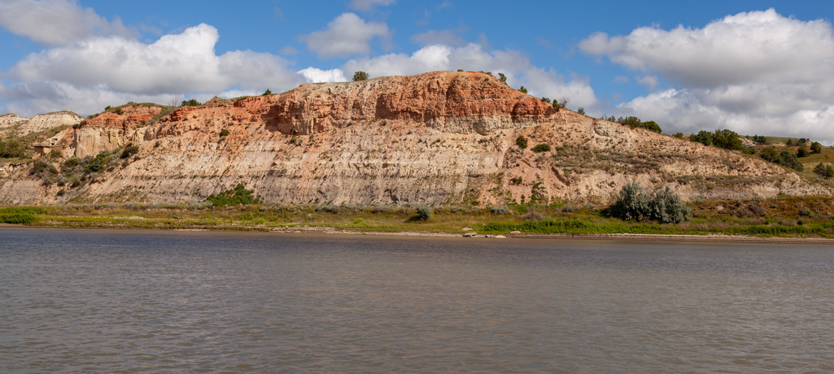 With a tailwind most of the day, the enlisted men move the boats 24 miles up the Missouri. They see great quantities of wild game and remark on the bright, colored layers of the Fort Union Formation exposed in the river hills. Camp is below present Culbertson, Montana.