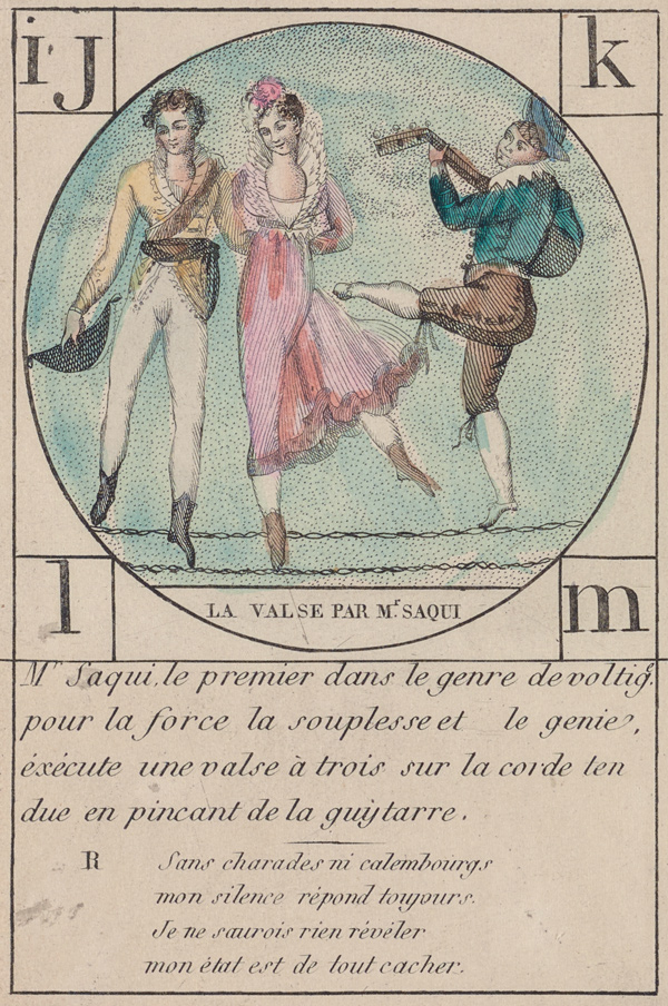 The above engraving is from a series of alphabet cards. Mr. Saqui is likely Jean-Julien-Pierre Saqui who married the celebrated rope-dancer Marguerite-Antoinette Lalanne in 1805. They performed in Europe, primarily in France.[2]“Madame Saqui”, Wikipedia, en.wikipedia.org/wiki/Madame_Saqui accessed 10 January 2026. The card reads: