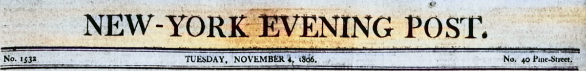 | ↑3 | The New-York Evening Post, 4 November 1806, page 3. For Clark’s original letter, see Letters of the Lewis and Clark Expedition with Related Documents: 1783–1854, ed. Donald Jackson (Urbana: University of Illinois Press, 1978), 1:325–330. Lewis’s draft that Clark likely copied can be read on pages 1:330–335. |