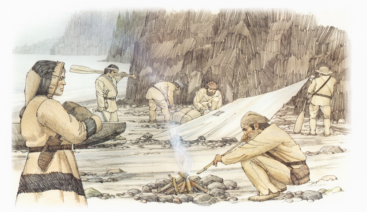 After a rainy night, the men paddle down the Columbia in the rain. From various villages near the mouth of the Cowlitz River, they buy salmon and wapato and are told that Captain Haley visits the mouth of the Columbia. At their camp at Little Cape Horn, they build large fires to dry out and kill the fleas infesting their blankets.