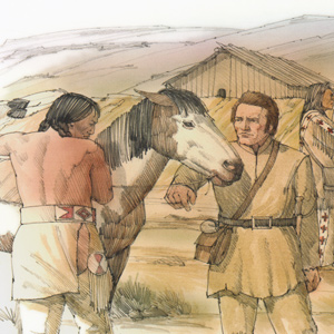 At Fort Mandan, Sgt. Ordway sends two men to Mitutanka to trade for corn and beans. Pvt. Joseph Field kills two buffalo, and a trader from the North West Company comes to collect one of Charbonneau’s horses.
