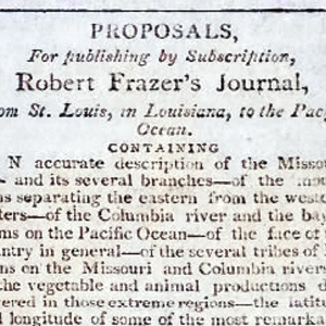 Former expedition private Robert Frazer’s prospectus to publish his journal appears in the “Pittsburgh Weekly Gazette”. He promises much in the lines of Western geography, ethnography, and natural history—much to the displeasure of Meriwether Lewis.