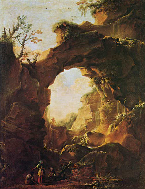 Rosa’s Grotto with Cascades (above) is a fictitious scene embodying some of the elements of sublimity. It can serve us as a catalog of the basic elements of sublimity in nature. The hour is either mid-morning or mid-afternoon. In the warm, radiant sunshine, two vaguely recognizable visitors, drawn to the dizzying brink of an amphitheater by the rumble and splash of falling water, stand awestruck by its terrible majesty. Far below, three common people (we can tell by the way they’re dressed) converse contentedly, oblivious of the romantic grandeur surrounding them. They are at ease in the cool, pungent, mossy shade beside a decaying tree trunk and the remains of a ruined stone wall, the latter revealing that a long-dead resident once embellished the place with some sort of an “improvement.” Indeed, taken together, the human figures, provide only the measure of the scene’s proportions and meanings.