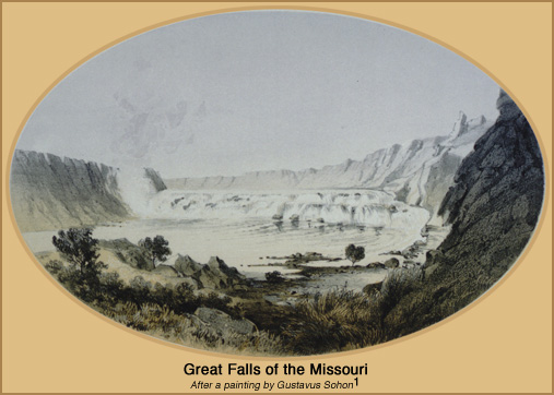 No known painting or drawing was made of the Falls until the early 1850s when Gustavus Sohon (1825-1903), a gifted young German immigrant who enlisted in the army in 1852, became an interpreter, guide, and topographic artist on the government-sponsored northern railroad survey led by Isaac Stevens in 1853-54. Lithographs made of a dozen of Sohon’s many drawings were published in the expedition’s report. One of them was that of the Great Falls of the Missouri, shown above. The earliest existing photograph of the Great Falls was taken by F. Jay Haynes in 1880.