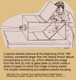 In 1676 a German mathematician added a mirror to re-invert the image onto a glass plate, upon which anyone could copy the image on translucent paper. In 1685 a German monk introduced interchangeable lenses of various focal lengths, to accommodate a broader range of subjects, from wide-angle landscapes to closeup portraits. Meanwhile, camera obscuras had become small enough to be easily portable, like the one pictured above, and were popular throughout Europe and America among artists as well as amateurs.